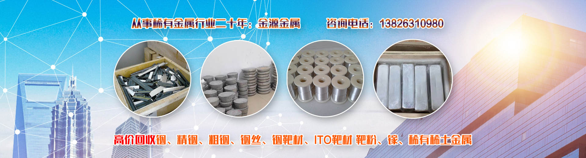 韶关市金源金属材料有限公司坐落于中国广东省韶关市,长期收购回收铟、精铟、粗铟、铟丝、铟靶材、ITO靶材靶粉、回收金属锗、锗锭、锗粉、锗片、回收锗单晶、单晶锗、锗粒、区熔锗、工业锗、废锗、锗泥、锗渣、二氧化锗回收、四氯化锗、有机锗、银、纯银、银靶材、高价收购回收ITO废靶、回收废铟、废铟沙、废铟渣、回收粗铟、废铟丝、废铟珠、废铟箔、废铟棒、收购银焊条、银焊丝、导电银胶、金属镓、硝酸镓、氧化镓、三氯化镓、氯化镓,供应及回收氧化镓、氢氧化镓、碲化镓,硒化镓,铟粉,氧化铟、氯化铟、硫酸铟、硫化铟、醋酸铟、氢氧化铟、硒化铟,碘化铟,铜铟镓硒,含金、银、铟、铑、钯、镓、锗等稀有贵金属材料,稀土金属材料、氧化镝、氧化镥、氧化铽、氧化镨钕等回收。